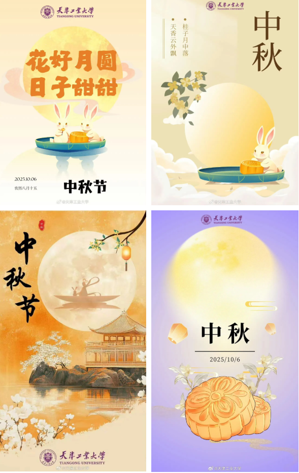 天津工业大学官博发布中秋主题海报,天津工业大学团委、天工物理微信公众号发布中秋祝福视频,表达学校对广大师生校友的节日关怀。天工生科、天工电子信息、天工化学、天工纺织等微信公众号推出《网络中国节•中秋丨月光漫千年 团圆意绵长》《网络中国节•中秋丨天涯共此时,祝您中秋快乐》《网络中国节•中秋丨今日中秋,祝你“月”来越好》《网络中国节•中秋丨祝大家节日快乐!》等图文,讲述中秋传统、中秋习俗、中秋历史,传承中秋文化,涵育家国情怀。